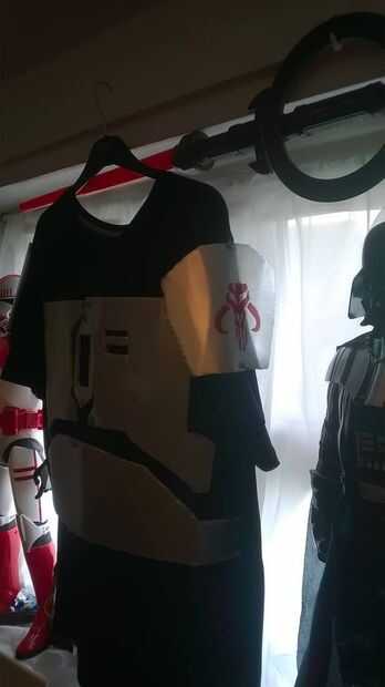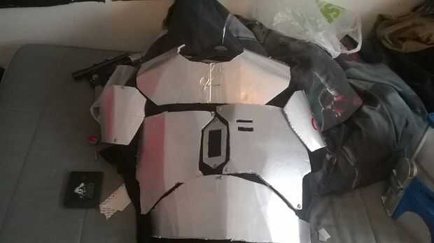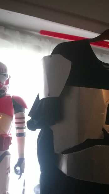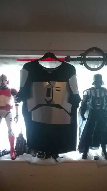 Este bit es una pesadilla hacer bien. Utilizando las piezas de armadura, comienzan a clavija a tu camiseta negra gran tamaño, tener en cuenta que estos deben ser rectos y alineados con el diamante, lo que hice fue alineado el diamante con el medio del cuello de la camiseta y trabajó hacia abajo a partir de ahí, entonces usted puede alinear las piezas de pecho según el diamante del centro. Los hombros son una brisa, clavija de la parte superior de la armadura del hombro hasta el punto donde el brazo de la camiseta begings ir diagonalmente y luego otro pasador en la parte inferior de la armadura. La armadura del vientre tiene 3 clavijas, uno en cada lado de la armadura y en el centro. El collar será aún más difícil, ya que esto necesita ser velcro en, por lo que es más fácil despegar, otra vez, ya sea lado necesita alinearse con los hombros de la camisa.