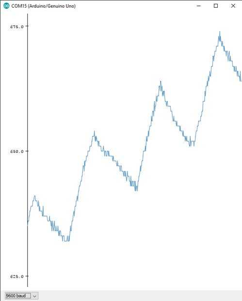 Abren serie del trazador en el Arduino y brille su indicador del laser en el disco piezoeléctrico. ¿Ves un cambio en el voltaje? Teniendo el puntero láser y haga clic en él y apagar unas cuantas veces, usted pueden ver la forma de onda escalonada de diente de sierra generada en la foto de arriba.