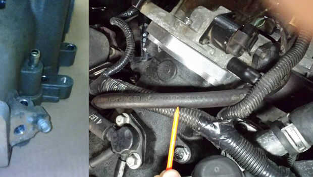 En este intercambio se cambio de las L67 al sistema EVAP L32. Para realizar este intercambio solo Instale el L32 EVAP válvula de purga en el sobrealimentador (ver foto izquierda) y conecte la línea EVAP. Esto puede tomar un poco de paciencia mientras que usted necesita doblar cuidadosamente la línea a la nueva ubicación asegurando que no retuerza la manguera. También ya que no está utilizando la acción EVAP necesita conectar el puerto en el cuerpo del acelerador con una especie de tapón de goma.