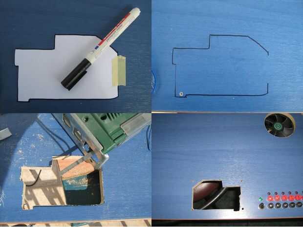Como la placa de montaje tomamos un acrílico blanco grueso 10 x 16 cm 10mm. Arte hecho hicimos una máscara de recorte para los orificios y la madera que se llevará a cabo todos. Después de terminar los agujeros y cortes de madera todo estaba en su lugar y otro de 10 x 16 placa de acrílico transparente se puso delante de todos para dar ese aspecto de buen profesional.