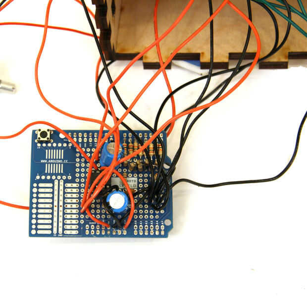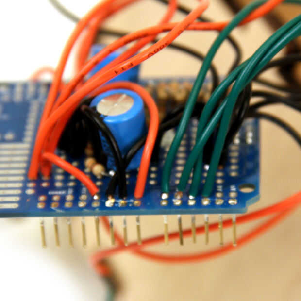 Conectarse leemos todos los cables del botón de 5V y el negro los cables a tierra en el escudo de arduino (fig 1). Conecte los alambres verdes a analógica de 0-3 en el siguiente orden: