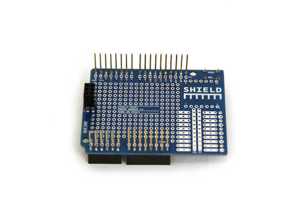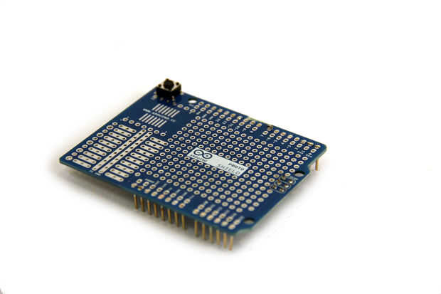 El Arduino Proto Shields son una forma conveniente para fijar los circuitos a un Arduino, pero me gusta recortarlo un poco hacia abajo para que no ocupen tanto espacio en el recinto del proyecto. Empezar por recortar las patillas hacia abajo con un par de cortadores de alambre. A continuación, corte la toma de seis pines. Finalmente, cortar las tomas de la parte superior de la Junta.