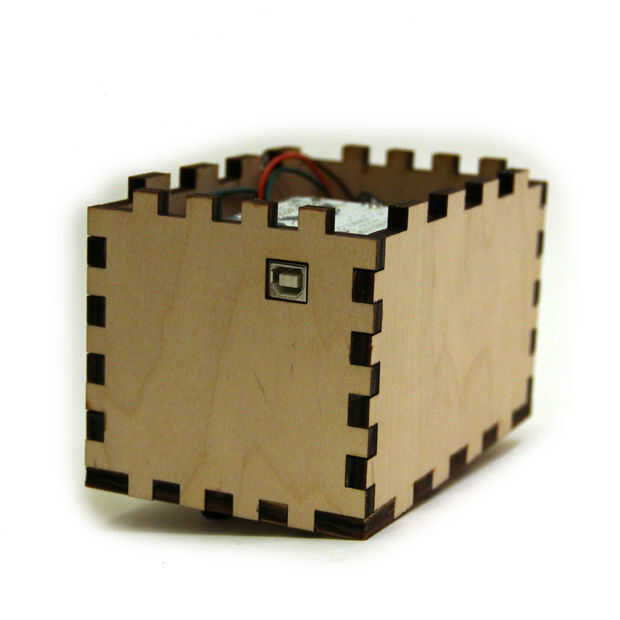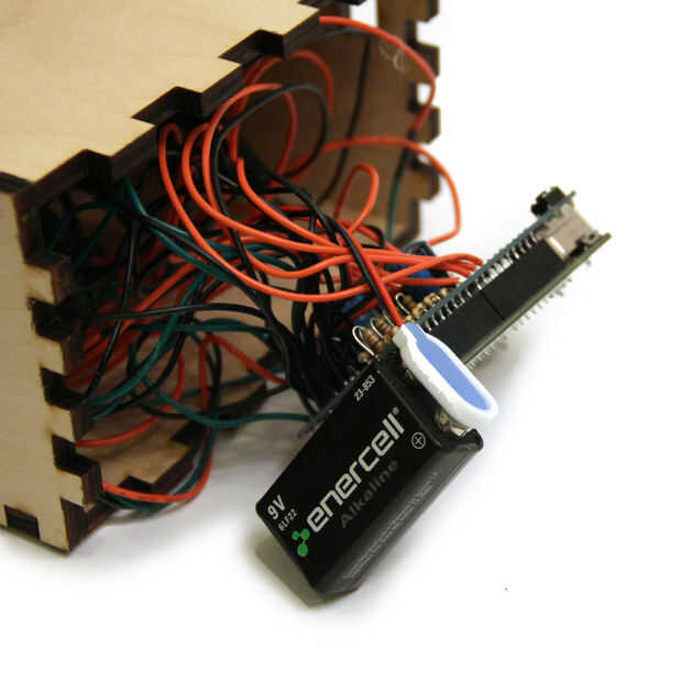 Enchufe el Arduino en su escudo.  Conecte una batería de 9V al clip de la batería.  Garantizar estos elementos dentro de la caja.  Asegúrese de que el puerto del usb de Arduino es accesible desde el exterior del recinto.  Al inicio debe ver el LED enciende para arriba la onda de seno.