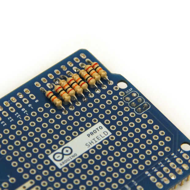 Ocho 20kOhm resistencias a la arduino protoshield de la soldadura.  Uno de los extremos de cada resistor debe conectarse a los pines digitales 0-7.