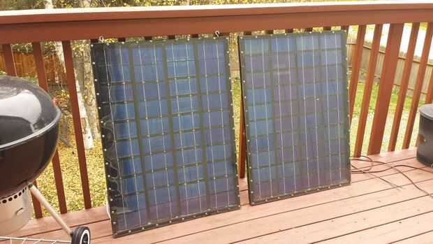 Utilizar los paneles solares caseros y extensión que ver cargar el generador cuando puedo pero también tengo un cargador de baterías de 12 voltios que utilizo cuando no brilla el sol. Los paneles que tengo aquí igualan aproximadamente 100 vatios de potencia de carga en un día soleado. Tengo 5-6 amperios de los paneles.