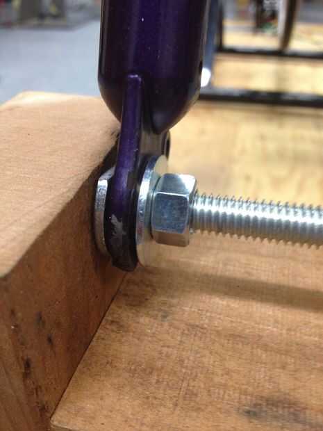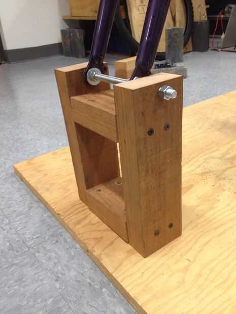 Construcción del stand de rueda delantera: La horquilla tenía un orificio de 1 cm de diámetro, así nos encontramos con un taco de una pulgada para descanse sobre. Además, tomamos una viga de madera de 1,5 "x 3" y cortarlo en dos 9.5" y 4.5" a dos cuadras. Hemos perforado un agujero de 1cm 1/2" hacia abajo desde la parte superior de cada uno de los bloques de 9". A continuación poner la varilla a través de los bloques y montar el soporte (ver foto arriba). Hemos añadido algunas arandelas y las tuercas para hacer las conexiones más seguras. Los dos bloques de 4.5" deberán cortarse para caber firmemente entre los bloques de 9", como se muestra arriba. Después de construir el soporte de la bicicleta, la rueda delantera debe sentarse cómodamente en los bloques. A continuación, atornilla el bloque inferior de 4.5" a la madera contrachapada. Por último, atamos el bloque superior de 4.5" para la estabilidad. Ahora el soporte de bicicleta para la rueda delantera está completo y debe sentarse cómodamente en la barra entre los bloques.