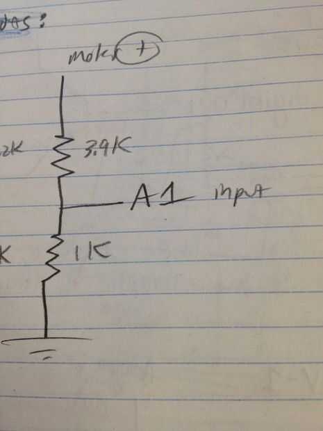 Un sencillo bosquejo de este divisor de tensión está en la foto de arriba. Incluyo todo el código de arduino en otro paso. Utilizamos una resistencia 3,9 K y 1K para reducir la tensión va en el arduino por un factor de 5. Tenemos todo para el pedal lo suficiente para conseguir el motor para ir encima de 17V, así que debemos estar seguros. Por lo general, estamos salir menos de 15V de nuestro motor. El divisor de voltaje se pone en una entrada analógica en el arduino que permite calcular la tensión del motor el arduino.