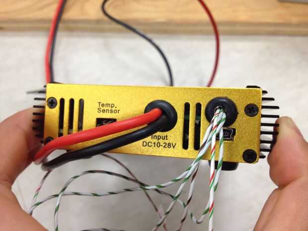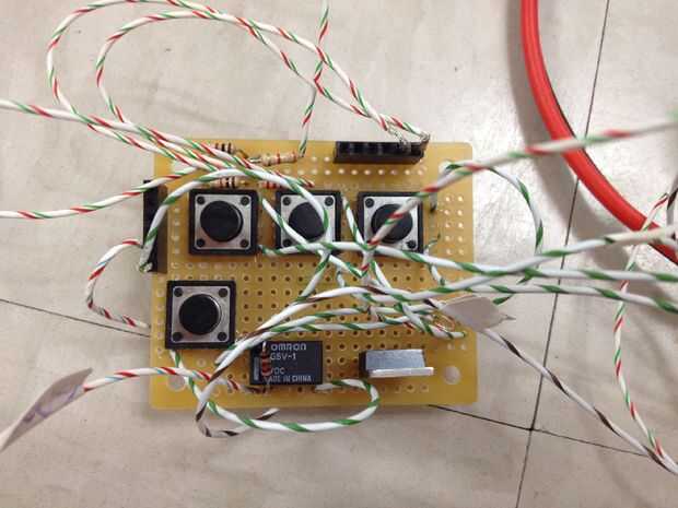 Hackear el cargador: Aparte tomamos el cargador desenroscando los lados y estallido de la tapa superior. Encontramos que había un alambre de la cinta los 4 botones de conexión a la placa de circuito. Había 5 cables en el cable de cinta, así que pensamos que podría ser un cable de "referencia" y los otros cuatro cables a los botones. Conecta el cable de "referencia" a cualquiera de los otros alambres del cuatro botón equivalía a apretar un botón. Tomamos un multimetro y había probado nuestra teoría, y es válido. Para un botón, debemos conectar uno de los cables con el cable de "referencia". A continuación, agregamos los cables a cada una de las cinco terminales donde el alambre de la cinta se utiliza para conectar a. Los cables fueron conducidos fuera el controlador de carga por taladrar un agujero a través del panel lateral y tirar a través. Estos cables conducen a nuestro escudo de arduino, que nos permitirá pulsar los botones y el botón de arranque autónomo mediante un relé de control.
