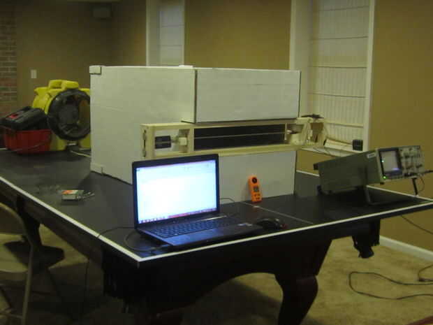 Primero arreglar la cinta entre los dos bloques de montaje en el bastidor. Luego usando un ventilador comenzar las pruebas de su generador de cinta. He hecho un túnel de viento de cartón para ayudar con las pruebas, junto con un osciloscopio. Con una velocidad de viento set, apretar o aflojar la cinta hasta llegar a un pico de tensión. Anote la cantidad de tensión en la cinta utilizando la escala. Se trata de la tensión perfecta para esta velocidad del viento. Conectar el windbelt a un LED y ver que flash con cada onda de la CA.