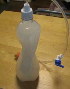 Cerrar la válvula en el tubo de conexión. Conecte un extremo a la botella de 1.5L pero completamente no apriete todavía.