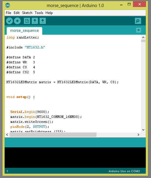 El código muy largo para que no pegue todo aquí, he unido como un archivo para descargar y enchufe en Arduino. He subido dos versiones: una que juega el alfabeto secuencialmente y otra que ciclos de letras al azar. El código de una tonelada de copiar/pegar y no es demasiado complicado, pero si alguien tiene alguna pregunta específica estaremos encantado de responderlas en los comentarios.