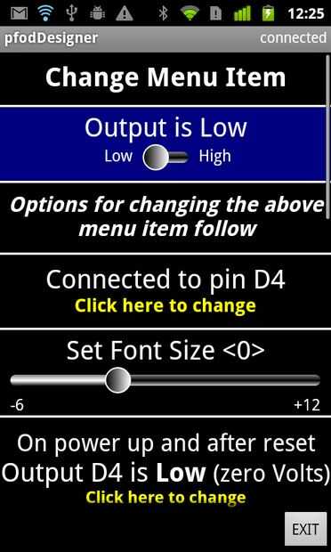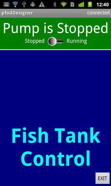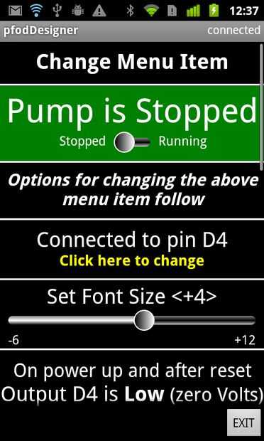 Ahora acabado diseñar este menú editando el texto principal "Es la bomba" y editar el texto baja al "Detenido" y editar el texto alta al "Funcionamiento". Tenga en cuenta el espacio en el final de "La bomba es". Establezca el tamaño de fuente a < + 4 > y el fondo en verde.
