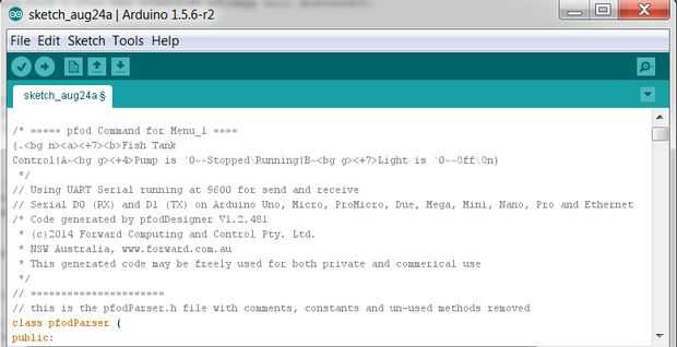 Abra el IDE de Arduino y hacer un bosquejo nuevo, eliminar cualquier código de la ventana de dibujo y copiar el código generado y en el IDE de Arduino. Una copia del código generado es aquí.