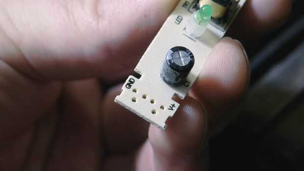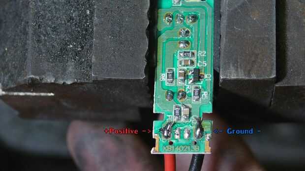 En el lado opuesto del tablero hay marcas para indicar de que terminal es el positivo y cual es el suelo, marcado V + y GND respectivamente. Había soldado un cable en cada uno de estos terminales que serán las conexiones para las baterías.