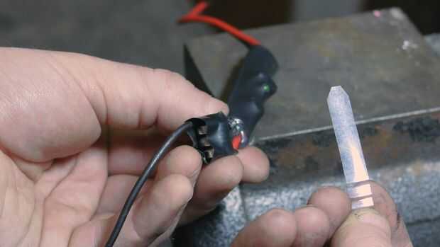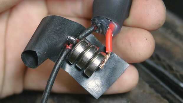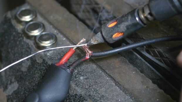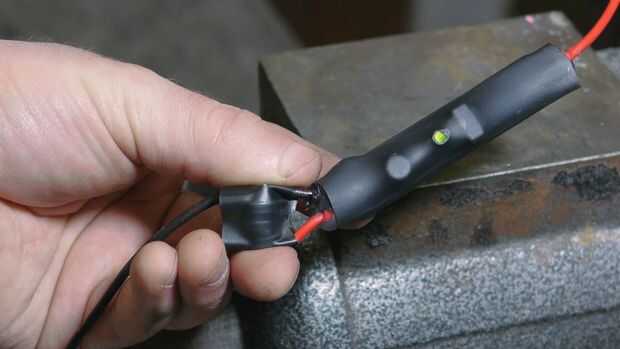 Para adjuntarlos, me tira una sección corta en medio del cable de tierra (aún dejando una cola larga aislada conectada) y pliegan para hacer una protrusión que se usará para presionar contra la negativa terminal de la batería. Pegué el pliegue expuesto de alambre con un poco de soldadura para mantener juntos.