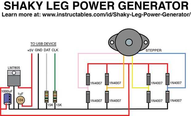 Hay básicamente, son dos puentes rectificadores - uno para cada bobina del motor. El condensador de 1000uF se utiliza para almacenar y filtrar la electricidad generada para crear una señal suave que luego se convierte en una constante 5V por el regulador de voltaje LM7805. Las 10uF y 0.1uF condensadores son energía adicional filtrado en la etapa del regulador.