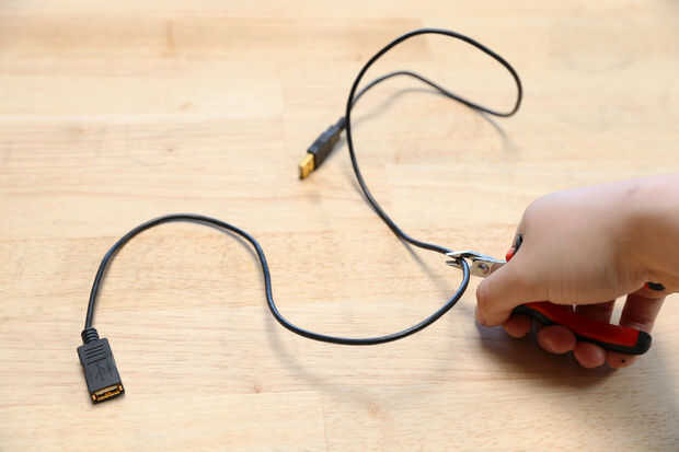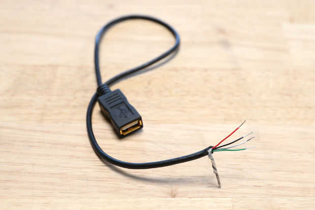Corte el cable USB a la mitad y exponer todos los cuatro hilos de cable.