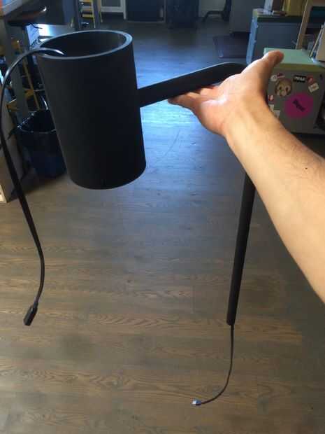 Montar el brazo de la cámara sobre el dispositivo del brazo de cámara, asegurándola con dos portaherramientas de diámetro interior de 1". Asegúrese de enderezarla perpendicular al frente y la parte posterior de la caja. Introduzca el cable USB a través del tubo de aluminio (este tengo encaja perfectamente), con el extremo hembra en el cilindro de la cámara y el extremo macho en la parte inferior del pedestal, a través del agujero pequeño para conectarse a la computadora.