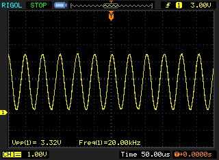 Aunque usted puede ingresar cualquier número que desee para las formas de onda estándar (sinusoidal, cuadrada, de etc) se debe limitar la frecuencia de 5Hz - 20KHz. Por ejemplo, a continuación se muestra la forma de onda de seno de 20KHz. Para ir más allá de 20KHz puede utilizar la función de forma de onda arbitraria en el siguiente paso para crear su propia forma de onda con menos datapoints (el dac es limitado por rapidez se copiar los datos, los datapoints menos en su forma de onda más rápido se puede ir).