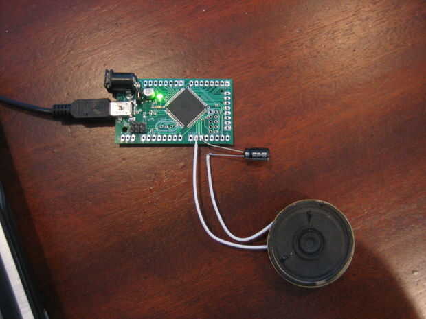 1) soldar un 47uF (o lo que tengas mano sobre 1uF) condensador electrolítico entre PORTB encabezado pin 3 y uno de los conductores de su altavoz.