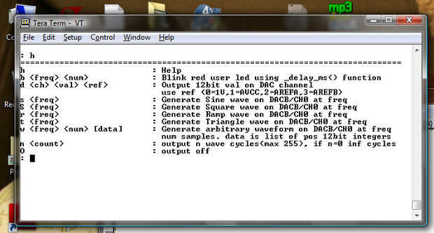 Después de conectar debe ser capaz de tipo 'h', que mostrará las instrucciones de uso para la utilidad de generación de forma de onda.