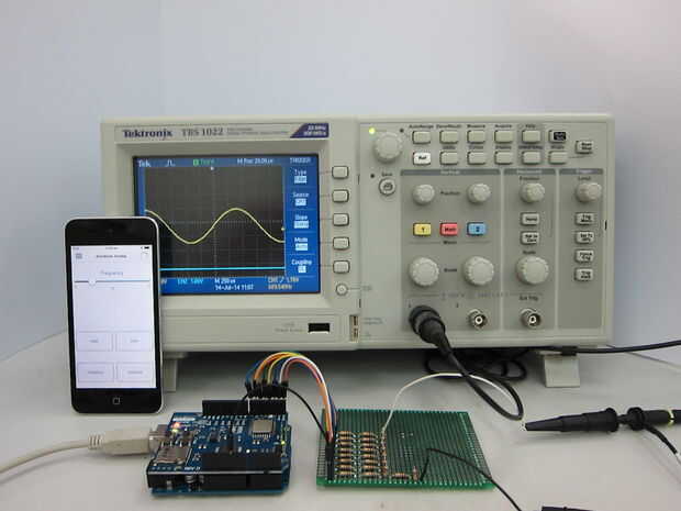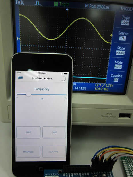 Este generador se basa en el trabajo de Amanda Ghassaei. Generadores de forma de onda (o generadores de funciones) se utilizan para probar y depurar circuitos. por ejemplo, respuesta de frecuencia de amp op o sensores. Este generador es alimentado por Arduino con Annikken Andee shield - un dispositivo que permite a los usuarios crear interfaces iOS/Android sin iOS o Android programación en todos. Salidas seno, triángulo, Sierra y ondas cuadradas. Frecuencia se controla mediante un slider (en dispositivos iOS/Android) y tipo de onda se selecciona mediante el botón de pantalla iOS/Android. Con una interfaz de iOS/Android, usted puede agregar ciertas características no es posibles con los botones de hardware. Por ejemplo, mostrar diferentes rangos de frecuencias para cada tipo de onda, mostrando significativas controla para ciertos tipos de onda. Por ejemplo, el regulador de modulación de anchura de pulso es visible sólo para los tipos de onda cuadrada, no es visibles para formas de onda seno, triángulo o sierra.