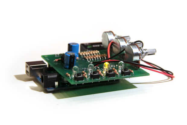 Generadores de forma de onda (también llamados generadores de funciones) son útiles para probar y depurar circuitos. Pueden ser utilizados para probar la respuesta de frecuencia de componentes electrónicos como sensores y amplificadores op o para caracterizar y solucionar problemas de pedales y efectos de audio cajas. Este escudo generador de forma de onda es alimentado por un Arduino. Salidas de cuatro formas de onda: seno, triángulo, pulso y Sierra, cada intervalos de la forma de onda en frecuencia de 1Hz - 50 kHz. La amplitud total (ganancia) de las formas de onda, frecuencia y anchura de pulso es controlada por tres potenciómetros. Cuatro indicadores LED le permiten saber qué tipo de onda actualmente se envía a la salida. Este Instructable describe cómo armar el Kit de escudo de generador de forma de onda de Arduino he diseñado, si usted está interesado que usted puede también ver mi post original sobre el generador de forma de onda de Arduino.