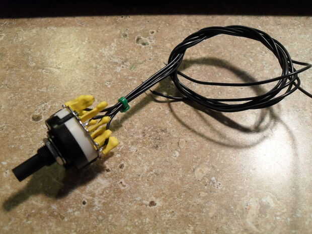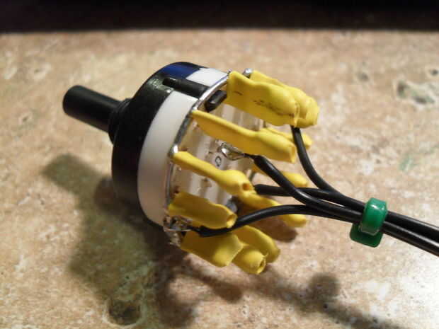 En la parte trasera del interruptor, hay dos alfileres en el centro y 12 pines en el exterior. Sin embargo, el conmutador puede diferir de mina, por lo que tendrás que averiguar por ti mismo. Los dos pivotes de la central se conectan a la placa de circuito, pero las 12 clavijas exteriores deben conectarse condensadores. Existen dos grupos de 6 pines, cada grupo que representa las conexiones de una cubierta del interruptor rotatorio. Puede que necesite un probador de continuidad para averiguar cual de las dos patillas centrales conectan a cada grupo de 6 clavijas exteriores. Cada grupo de 6 pines se conecta a los 6 valores diferentes del condensador. Al otro lado de estos condensadores deben conectarse a un cable común, pero no se pueden conectar todos los cables comunes de los dos grupos entre sí.