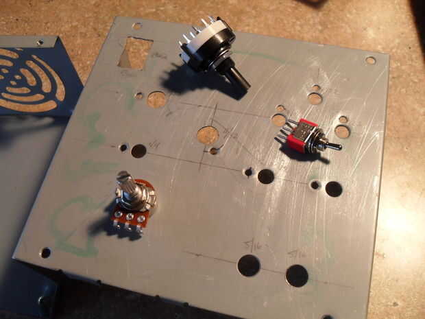 Una vez que todos sus interruptores y diales, usted necesitará decidir sobre un diseño de interfaz para ellos. Nada agradable y fácil de usar. Utiliza la tienda de máquina en mi universidad para perforar los agujeros, pero la perforación funciona también.