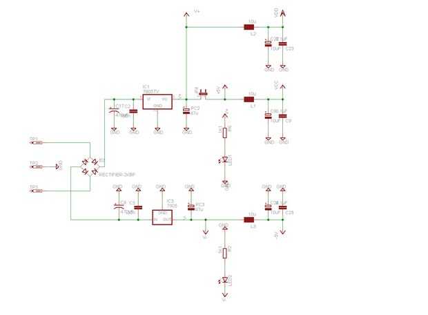 Como ya he dicho este generador requiere fuente dual. El voltaje positivo es creado por el uso de 7805 regulador de voltaje lineal. La fuente negativa es generada por el chip 7905. El punto de tap central del transformador 2x6V está conectado a la base común de la Junta. Las fuentes de energía - el positivo y el negativo están separadas para analógica y digital por cuñas. Dos LEDs indican la presencia de cada fuente.