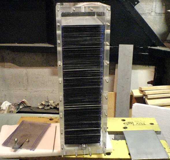 Ejemplos a continuación, la celda de su extremo es mi trabajo de serie de la placa 120 big daddy (119 células) escurr directamente había rectificado interno 240 V AC. La conexión negativa está en el fondo ya en el caso con el pos en espera de su vuelta a la izquierda. Hay ningunos agujeros de compensación perforados en las placas, por lo que es una célula de la serie verdadera siempre y cuando el nivel del electrolito se mantiene por debajo de las tapas de la placa.
