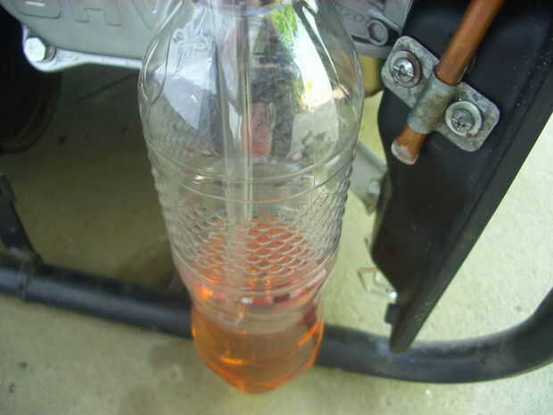 pensé que sería necesario para visualizar el paso del gas, para apreciar la cantidad de flujo. Eso no es nada más fácil que hacer burbujear el gas en un líquido y luego recuperarlo, tratando de mantener el líquido contamine el gas. Utilicé un pequeño refresco PET botella, hice dos agujeros en la tapa de plástico e ir sobre dos tubos de PVC suaves. Uno, la entrada, alcanza la parte inferior, y el justo pasa la tapa una media pulgada. Como líquido burbujeante utiliza diesel, que se evapora muy poco y espero que no altera la calidad del gas natural. Por lo menos no es notable.