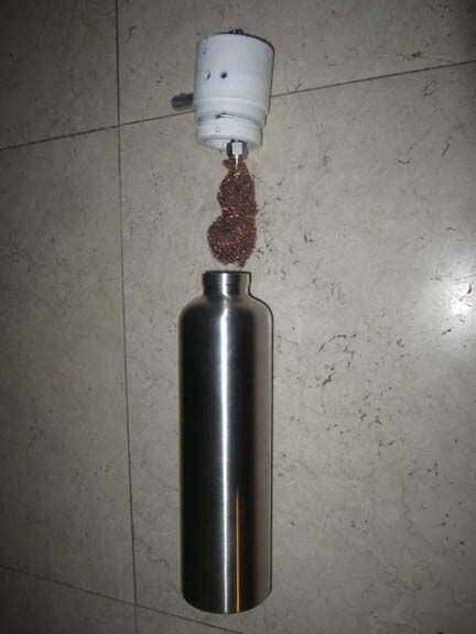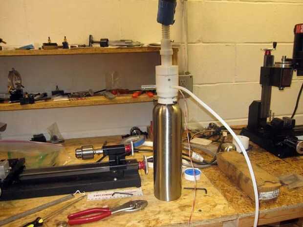 El depósito tiene el gas licuado recogidos, ya sea aire o N2. Una botella de vacío de acero inoxidable simple o un termo como muchos de ustedes lo sabría, sirve muy bien. Esta simple solución que me eludió durante algún tiempo. El truco es un adaptador que le permite contener el gas expansión y directa a la tubería de teflón de la regeneración que rodea a la tubería de acero inoxidable de alta presión de la moda. Los detalles, junto con todos los otros métodos que probé, pueden encontrarse en mi extenso tutorial en http://homemadeliquidnitrogen.com