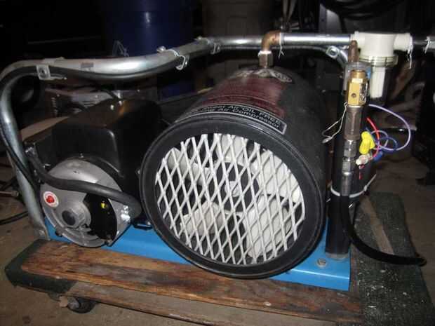 Este es el componente más caro. Usé un RIX sin aceite SA-3E. Esto ofrece 3 SCFM a 3500 psi (230 ATM). He modificado el motor y las poleas para entregar 4 SCFM. Un flujo más alto le da un enfriamiento más rápido y la tasa de producción. La presión alta le permite tener una mayor disminución de temperatura cuando de la válvula reguladora del gas a una presión más baja. Se puede utilizar un compresor de nevera regular, pero esperando el tiempo baje a 400 grados Fahrenheit de la temperatura ambiente a - 320F si sólo tienes 40 ATM de presión.