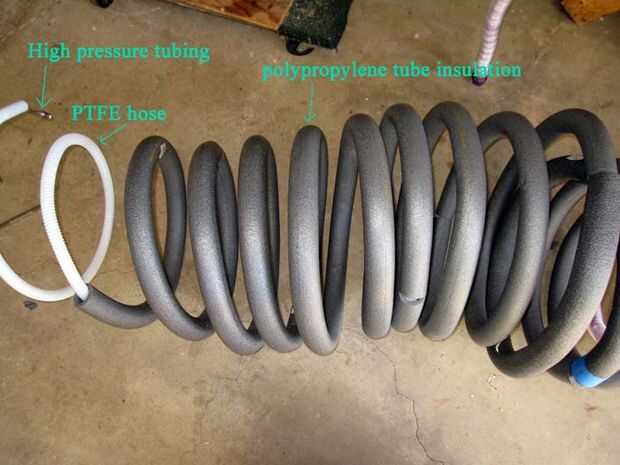 He utilizado 305 acero inoxidable 1/4" tubería con un espesor de pared de 0.035". Hay muchos lugares que venden esto cerca de usted. Si vas a hacerlo con un compresor de refrigerador estándar que se puede utilizar tubería de cobre. Sólo asegúrese de que está clasificado para la presión del compresor. Ahora el tubo de PTFE (teflón) es fundamental. Es uno de los pocos materiales que es flexible y puede soportar temperaturas criogénicas. Yo tubería plástica al principio, pero eventualmente se agrietaría.