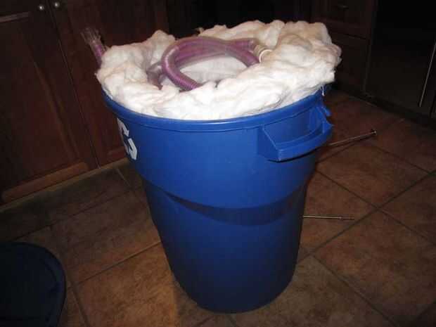 Luego inserta la bobina en el tacho de basura o el contenedor. Fabricantes industriales llenan el contenedor con perlita y crean un vacío para evitar que el calor entrando por el medio ambiente. Llené mi contenedor con lanas de alta temperatura de sílice alúmina. Normalmente se utiliza para aislar hornos para contener el calor. ¿Bien, adivinen qué? También contiene el calor del exterior entren a nuestras bobinas. Usted necesita rellene el contenedor con el material por lo que permanece esponjosa. El aire es también un excelente aislante.
