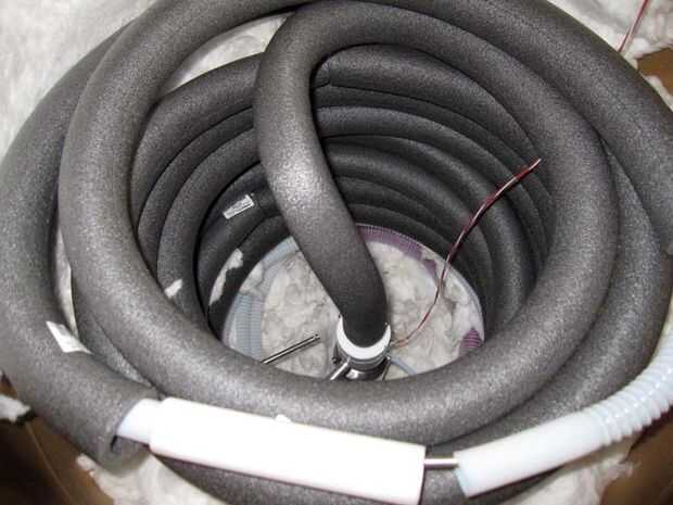 Esta es la parte que tendrá más trabajo. Mi torre final utiliza un contenedor grande encofrado cartón 50 pulgadas de alto y 24 pulgadas de diámetro. Sin embargo, he tenido buen éxito con una versión anterior que utiliza una lata de plástico reciclar 36 galones. El gas comprimido entra en la torre a través de una bobina helicoidal larga y se vuelva a expandir a través de una válvula de aguja en el extremo en el depósito. El gas frío que licuar no se devuelve a través de la tubería del Teflon alrededor de esta bobina. Este gas frío enfría los tubos aún más. Este proceso se repite hasta que la tubería de acero es lo suficientemente fría como para licuar el gas.