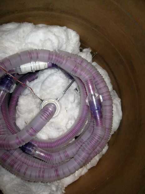 Las fotos de arriba muestran utilizando el contenedor de reciclaje de 36 galones. Al final de este tutorial, verá el envase de forma concreta que alberga un mayor funcionamiento de bobina. La tubería de acero inoxidable está rodeada por la tubería del Teflon. Esto, a su vez, está envuelto con espuma de polipropileno para disminuir aún más la penetración del calor.