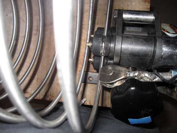 Mi torre utiliza 80 pies de tubería. Usted puede hacer esto con 40-60 pies, pero esto aumenta el tiempo de enfriamiento. Otra vez, todo es sobre disyuntivas. Es necesario insertar la bobina de acero en la tubería del Teflon. Desea que el diámetro de la tubería de teflón para ser un poco más grande que la bobina. Mina fue 1" acanalada la tubería que le permite ser flexible. Esto envuelve sobre los tubos de acero inoxidable de 1/4".