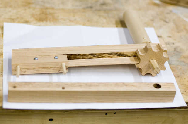 Intercala la Junta rígida entre dos tableros (a 3 1/2 pulgadas de largo y un poco menos de 3/8 pulgada de espesor) y toda la cosa bien atornillados. Es muy similar a la celebración de un mango de cuchillo. La anchura de estos tableros es ligeramente más grande que el ancho del tablero rígido o equipo. Esto da el engranaje de un poco de respiro a girar libremente.