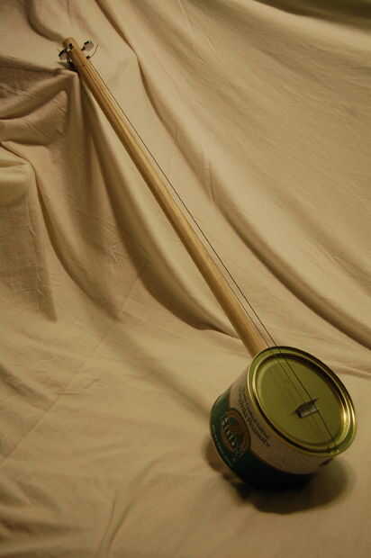 Supongo que se podría llamar un Diddley Bow modificado. En su forma más simple un Diddley Bow es un palo con una cuerda de guitarra clavado a ella bajo la tensión que se juega con un portaobjetos (vidrio o metal). En serio, es una cosa. Se trata de un juego con 2 cadenas y un cuerpo de una lata que se utiliza para contener maní. Mi versión es puramente acústico. Sería demasiado duro para electrificar con un pickup piezo.