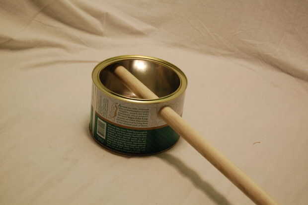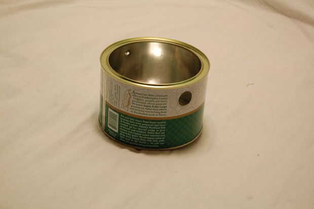 Inicio por tomar su hermosa nueva lata y perfore un agujero del mismo tamaño como la vara de la clavija. Para este diseño, mantenga la espiga cerca de la superficie plana del estaño pero no dejes que toque. Por ejemplo, mi tin tiene una tapa empotrada que se sienta cerca de un cuarto de pulgada en el cuerpo. Perforé el agujero para que el borde de la espiga recorrió la lata sobre una octava pulgada desde el interior la superficie de la tapa. Comience con un pequeño agujero piloto y luego suba con la broca escalonada.