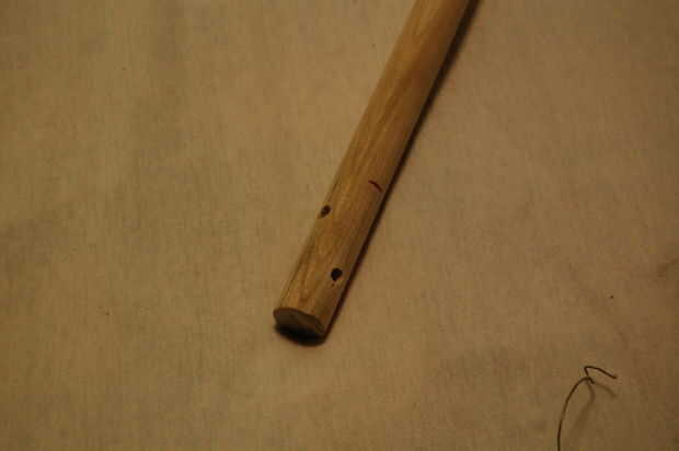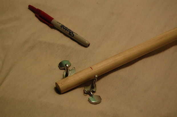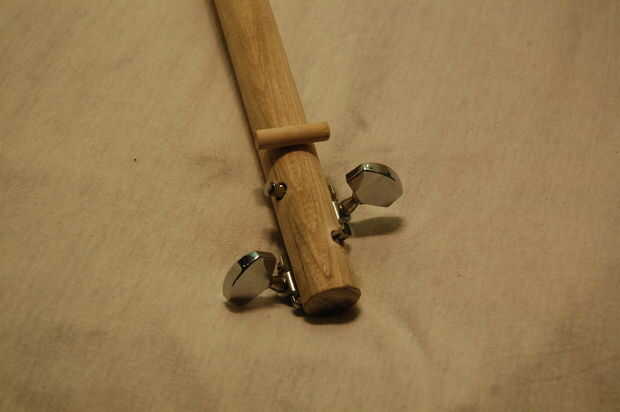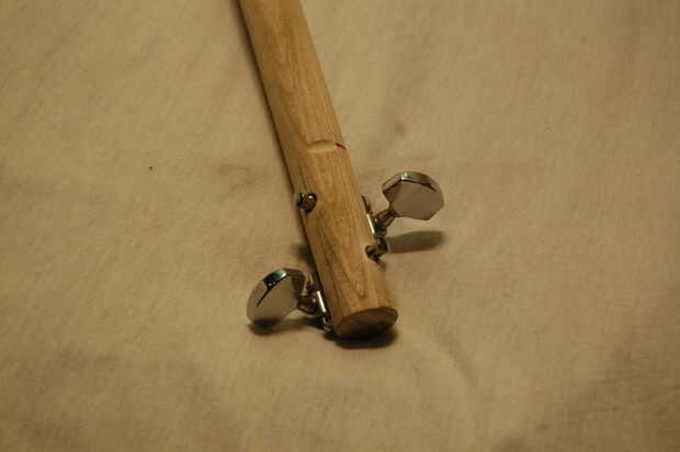 Con la espiga cortada, averiguar la ubicación de los sintonizadores. Como se puede ver que decidí hacer mina de Monte Cruz-formas en la cabeza. Luego perfore los agujeros y los afinadores en la cabeza del tornillo. Justo debajo de los sintonizadores en el cuello de la espiga, presentar una ranura poco profunda para el pedazo corto de 1/4" espiga. Este es el lugar de la tuerca.