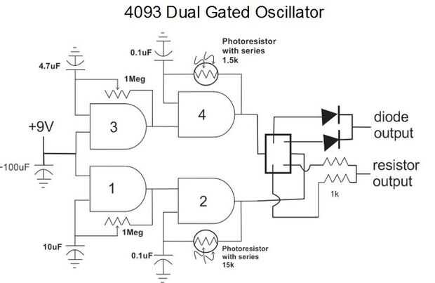 El dispositivo presentado aquí es realmente un par de osciladores cerradas, con las salidas atadas a través de resistencias de diodos (conmutables). El acoplamiento diodo produce un tipo interesante "modulador del anillo" de sonido. Esta diseñado para que la primera etapa actuaría para configurar un tipo de establo "beat". Mediante un condensador de 10uF y un potenciómetro de 1Meg, las frecuencias son muy bajas. Esto activa y desactiva la segunda etapa que utiliza un 0.1uF condensador y una fotorresistencia. No hay ninguna razón que los 4 no puede ser conectado junto, o macetas o resistencias de la foto no se puede utilizar para cada etapa. (por embarque de pan es una buena idea — toneladas de la libertad de diseño con piezas fácilmente intercambiables).
