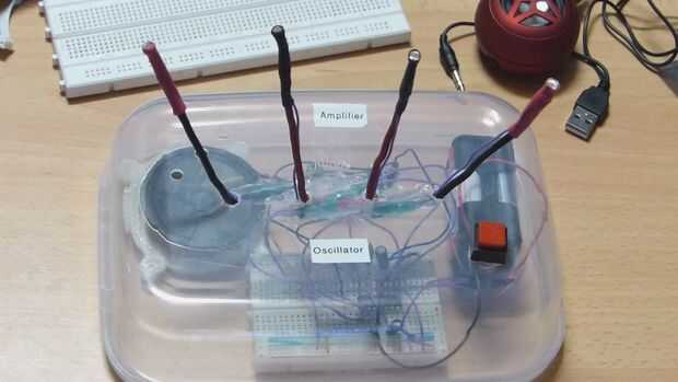 Este es un generador de ruido. Se conecta un aun amplificador de guitarra o cualquier consola, y al mover las dos perillas géneros diferentes ruidos con textura de corriente eléctrica. Utiliza libremente la idea de onda diente de sierra, pero el obje