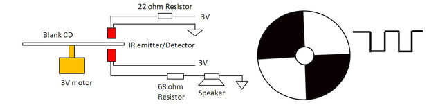 El diagrama de bloques se muestra a continuación (diagrama de bloques). El motor está girando a velocidad constante. Hay oscuras (no transparente) y las porciones transparentes del CD. Cuando la porción oscura del CD está entre el emisor/detector de IR, la resistencia del detector será alta y el voltaje en el altavoz será bajo. Cuando la porción transparente del CD está entre el emisor/detector de IR, el detector recibe la señal del emisor, y su resistencia será baja, así que el voltaje en el altavoz será alto. La señal de voltaje a través de los altavoces es una onda cuadrada. Variando la velocidad de las porciones del motor y oscuro/transparente en CD, la frecuencia de los cambios de señal de ondas cuadradas. Usted puede oír los cambios desde el altavoz.
