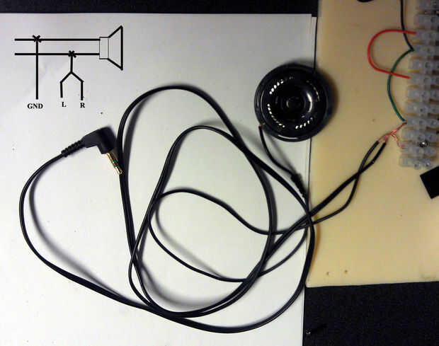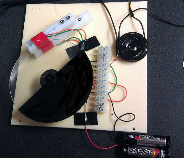 Ahora puede conectar la batería, conecte el pin positivo motor de + 3V terminal. El detector IR es encendido y apagado dependiendo de qué parte del CD está debajo de él. Se puede escuchar el sonido del altavoz también. Si tienes un osciloscopio, puede conectarlo a los altavoces para comprobar la forma de onda y calcular la frecuencia. Si no tienes un osciloscopio, conecte a un 1/8" estéreo paralelo al altavoz. Conecte el cable de tierra a la terminal negativa, Trence el cable del canal L/R y conectarlo entre la resistencia de 68 ohmios y el altavoz. (cuadro 24)
