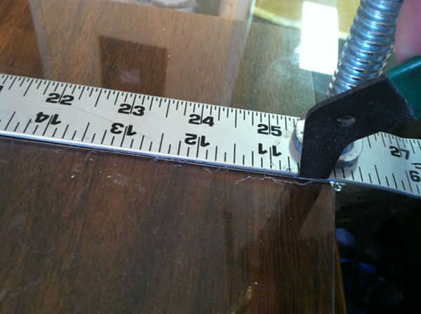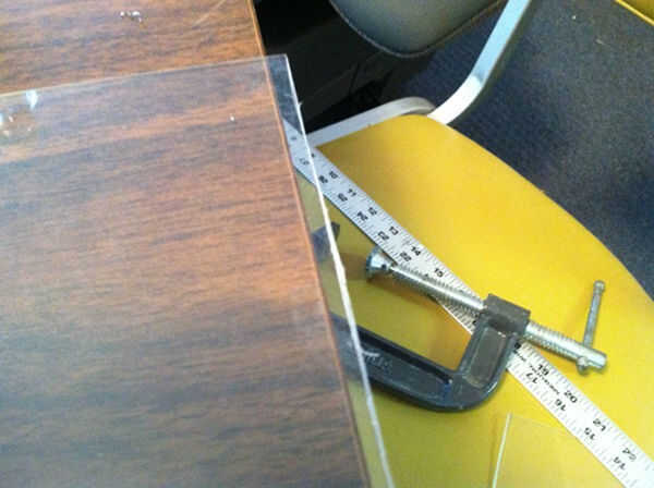 Aviso las imágenes que ligeramente he con abrazadera la regla en la posición a lo largo de la línea de donde quiero mi corte. Apriete la abrazadera demasiado claro se agrietará el plexiglás.