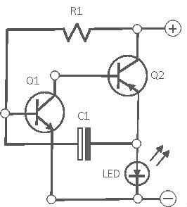 OK - solo para sumar todo para arriba - en el 'arranque' cuando primero se aplica la energía, Q2 será 'off' (no conductor) y Q1 se encenderá cuando su liderazgo 'base' es suficientemente sesgado 'en' a + 0,5 de un volt, por C1 carga a través de R1 y el dispositivo de salida (altavoces, LED o resistor de bajo valor para carril de tierra-ve) Cuando Q1 se enciende, su principal colector será 'tirar' hacia abajo cerca carril de tierra-ve (un corto circuito virtual), y esto proporcionará el sesgo - ve ese transistor Q2 (BC557) necesita en su base principal, para encender. Cuando Q2 se enciende, condensador C1 descargas vía el dispositivo de salida que se activa, y al mismo tiempo, vuelve de Q1 (BC547) apagado, y entonces el ciclo comienza otra vez.