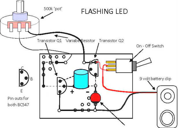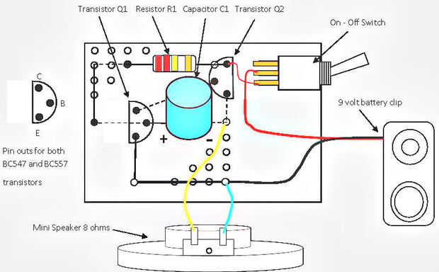 Escenario #1: metrónomo: el altavoz se haga clic en y regularmente, según el valor de la resistencia R1 (o el ajuste de VR1 - un resistor variable - comúnmente conocido como un 'recipiente'.) Así que en esta versión, VR1 sería realmente la variable k 500 'pot'. C1 es el condensador electrolítico de 10uF (ver la polaridad de eso!) Asegúrese de que va el cable positivo (+) de 10uF/C1 a la base de Q1 - BC547, y el cable negativo (-) va para el emisor de Q2 - BC557